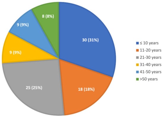 Age at diagnosis of GD. Thirty children were diagnosed at the age of 0–10 years, 18 at the age of 11–20 years, 25 at the age of 21–30 years, nine at the age of 31–40 years, nine at the age of 41–50 years, four at the age of 51–60 years, and four at the age of over 61 years.