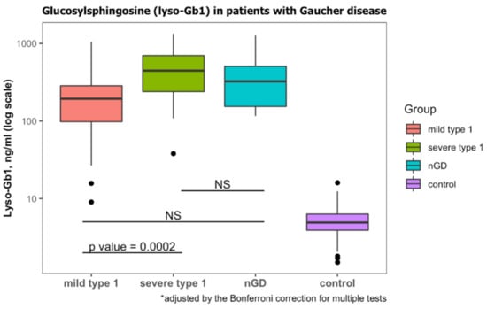 Lyso-Gb1 levels at diagnosis of GD. Classification of mild type 1, severe type 1 and neuronopathic GD (nGD) was based on genotypes. Lyso-Gb1 levels of subjects with wild-type GBA1 were considered to be the control. NS, non-significant. Black dots represent the outliers.