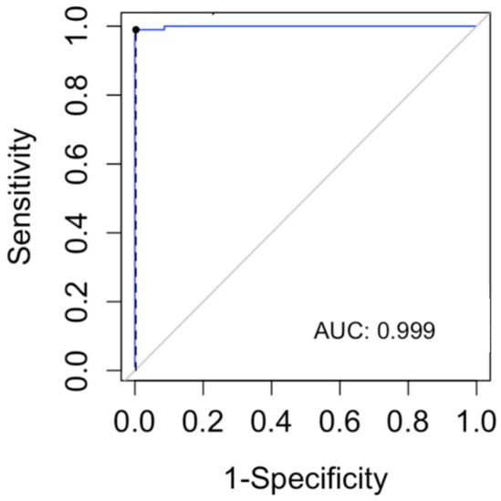 In order to determine a lyso-Gb1 cutoff level for the diagnosis of subjects with carrier status in GBA1 vs. wild type, we computed a ROC curve and searched for the cutoff with the maximum sensitivity for the diagnosis of subjects with monoallelic variants in GBA1 (Figure 5). The cutoff found in our data was 2.5 ng/mL (sensitivity 100%, CI 98–100%). The specificity of this cutoff was 6% (95% CI 2.7–11.1%).