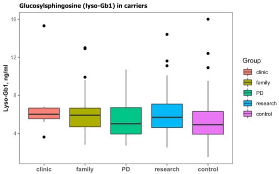 In the cohort, 188 (42.3%) subjects were identified with a heterozygous GBA1 carrier status (Table 2b). Those subjects were older than subjects with wild type and were mainly screened due to a family history of GD, a diagnosis of PD, or as part of research in prodromal PD (Table 4). Lyso-Gb1 was significantly higher in carriers than those with the wild type (Table 4). Carriers with PD had slightly lower lyso-Gb1, but this difference did not reach statistical difference (Figure 4).