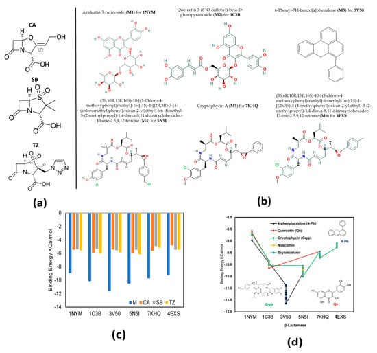 (a) Structure of ligands previously reported as β-lactamase inhibitors; (b) best docked ligands with lowest interaction energy; (c) plot of binding energy comparison between best docked ligand and β-lactamase inhibitors; and (d) plot of the best binding energy from the ten (10) docking for each one of the β-lactamase proteins selected and their structural similarities.