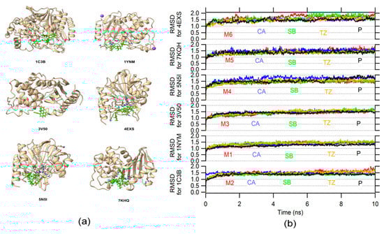 The initial position for molecular dynamics was set in the molecular docking result. A total of 24 systems (protein–ligand) were analyzed by molecular dynamics. Figure 2a shows the 3D structure of the six β-lactamase proteins (with their respective PDB IDs) docked with the best BE ligand (represented as green sticks). The RMSD variation is used to determine the structural conformation changes and stability in a protein []. The RMSD variation during the molecular dynamic reflects a stable behavior for each system with CA, SB, TZ, protein without ligand (P), and M ligands (see Figure 2b). Additionally, there was little difference between the RMSD variation of the proteins without the ligand and the proteins with the ligand. It is indicative that the structure, in general, remains similar, whereby the protein’s function should not be affected.