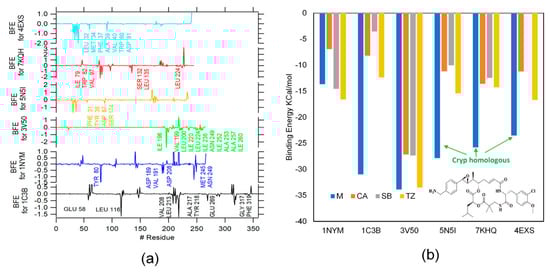Figure 3a shows the energy of each system, and are named residues with an energy contribution below −0.4 Kcal/mol. It can be observed how the BFE of the ligands is better in almost all cases compared with β-LICM, and the best β-LICM evaluated is TZ in all cases. The contribution for each residue in the BFE was evaluated through the energy decomposition option available in the MMPBSA Amber script. Figure 3b shows the contributions of binding free energy for each residue in their respective protein. The most favorable interactions are characterized by the lower BFE values (pointed out in Figure 3b). For 1C3B, the most favorable interactions are given by LEU 116 and ALA 217, for 1NYM the GLU 146 residue, for 3V50 the ILE 196 residue, for 5N5I the PHE 31 residue, for 7KQH the LEU 173, and 4EXS the PHE 37 residue.