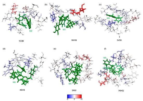Energy contribution per residue of the six β-lactamase proteins around 5 Å of the ligands (represented as green sticks), the blue and red residues illustrate the favorable and unfavorable interactions, respectively; residues with a higher than 1 and lower than −1 are named. (a) Complex 1C3B-M2, (b) 1NYM-M1, (c) 3V50-M3, (d) 4EXS-M6, (e) 5N5I-M4, and (f) 7KHQ-M5. This figure was obtained using the chimera plugin, CHEWD [,].