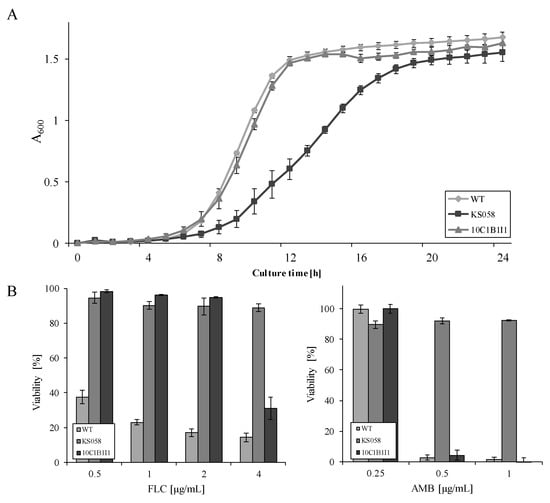 (A) The growth curve of the C. albicans SC5314 wild type (WT), erg11Δ/Δ (KS058) and the ERG11K143R/K143R (10C1B1I1) strains in a YPD medium (28 °C, 120 rpm; n = 3, ±SD). (B) The percent viability of the C. albicans WT, KS058, and 10C1B1I1 strains cultured for 24 h, 28 °C, in a YPD medium supplemented with FLC (left) or AMB (right) (n = 3, ±SD).
