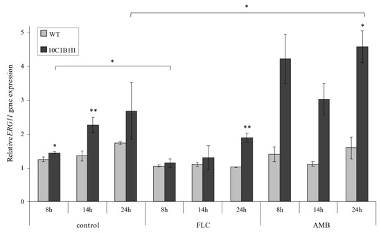 The relative ERG11 gene expression in the C. albicans SC5314 wild type (WT) and ERG11K143R/K143R (10C1B1I1) strains determined for different growth times (8, 14, and 24 h) and culture conditions: control (YPD medium alone), and with the addition of FLC (4 μg/mL) or AMB (0.25 μg/mL); ±SD; n = 3. Statistical analysis was performed by comparing the expression of the C. albicans WT and 10C1B1I1, or between the different culture conditions (*, p < 0.05; **, p < 0.01).