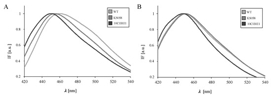 For C. albicans KS058 and 10C1B1I1, we detected a red shift for Laurdan IF at 8 h of culture (Figure 3A). The PM fluidity of the investigated strains decreased significantly at 24 h of culture (Table 2) and this was expressed in a deepened red shift of the Laurdan IFs (Figure 3B). However, the overproduction of ergosterol in the 10C1B1I1 strain resulted in 1.4-fold lower fluidity of the PM (positive GP value) comparing to the WT and KS058 strains.