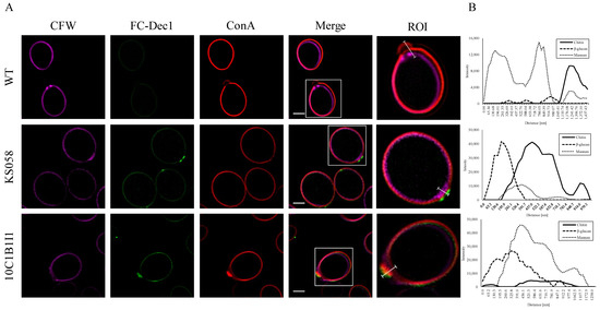 Triple staining of the C. albicans cell wall components for the SC5314 wild type (WT), erg11Δ/Δ (KS058), and ERG11K143R/K143R (10C1B1I1) strains (A). Total chitin was detected using calcofluor white (CFW) (purple). Exposed β-glucan was stained with Fc-hDectin-1 (FC-Dec1) and Alexa Fluor 448-conjugated anti-human IgG Fc antibodies (green). Mannans were detected using streptavidin and concanavalin A (ConA) conjugated with Alexa Fluor-568 (red). Scale bars of all presented images are equal to 2 μm. White squares on the merged picture represent region of interest (ROI). Fluorescence intensities for particular CW components for ROI (regions of bud scars; white lines) for investigated C. albicans strains (B). The distance [nm] between CW components is presented from outside to inside of the cell at the area of the bud scars.