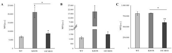 Analysis revealed the significant exposure of chitin and β-glucan in both the KS058 and 10C1B1I1 strains. This is supported by the detection of β-glucan signals in the most exposed fragment of KS058 and 10C1B1I1 CW in contrast to the WT (Figure 5). In the case of unmasked chitin (Figure 5A), we observed an MFI value for KS058 and 10C1B1I1 that is 3-fold and 1.3-fold higher, respectively, than for the WT strain, while exposed β-glucan MFIs are 17-fold and 1.3-fold higher for the KS058 and 10C1B1I1 strains, respectively (Figure 5B). This may be related to the local accumulation of unmasked β-glucan in the bud scars region of KS058. Our research indicates that the 10C1B1I1 strain possess a decreased amount of mannans (MFI 1.4-fold lower than the WT and KS058 strains; Figure 5C). Herein, we also demonstrated that increased ergosterol contributes to chitin and β-glucan exposure on the outside of the fungal cell, as well to a decreased mannan content (Figure 4 and Figure 5).