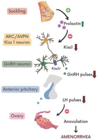 Lactation is strictly controlled by a series of reproductive and metabolic hormones that influence both mammary gland development and milk synthesis. Despite the fact that exact mechanisms standing behind hypothalamus–pituitary–ovarian axis alternation during lactation are still not clear, a general overview of events leading to amenorrhea may be suggested. Suckling remains the most important stimulus maintaining suppressive effect on ovaries after pregnancy. Breastfeeding is accompanied by high levels of prolactin that remain higher than normal until the frequency and duration of daily suckling decreases and allows normal menstrual function resumption. Hyperprolactinemia induces the suppression of hypothalamic Kiss1 neurons that directly control the pulsatile release of GnRH. Disruption in the pulsatile manner of GnRH secretion results in a strongly decreased frequency of corresponding LH pulses. Inadequate LH secretion and lack of pre-ovulatory surge inhibits the progression of the follicular phase of a menstrual cycle and results in anovulation and amenorrhea.