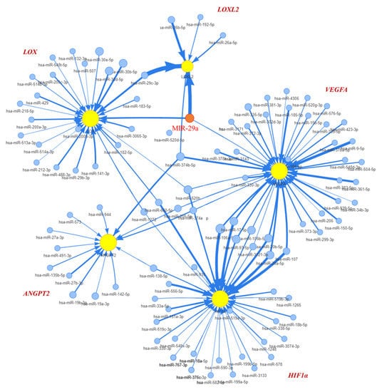 Interpretation of miR-29a regulates HIF1A and ANGPT2 expression. The OncoMir database analysis delineates the miR-29a interaction edge that suppressed the expression of HIF1A, ANGPT2, and VEGFA.