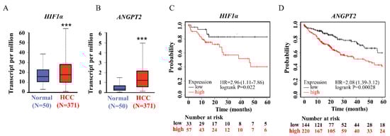 The HIF1A and ANGPT2 expression were committed on HCC patients. (A,B) The HIF–1 and ANGPT2 expression levels in human HCC and normal tissue by regained of TCGA cohort database. (C,D) The HIF–1 and ANGPT2 expression levels are significantly correlated with the probability of survival in HCC patients by Kaplan–Meier survival analysis. *** p-value < 0.001 was comparative between the normal and HCC group.