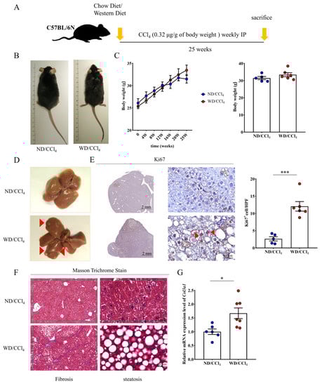 To generate a clinical comparative animal model and accelerated progress of HCC, we followed administration procedures described by Tsuchida et al. [25], which consists of multiple treated CCl4 with Western diet feed as the WD/CCl4 group (Figure 3A). Feed WD was shown to enhance and accelerate the roughness of fur, but there was no significant difference in body weight compared with the normal diet (ND) plus CCl4 group (Figure 3B,C). A significant discrepancy in liver pathology was observed between ND/CCl4 and WD/CCl4 groups. After 25 weeks of WD/CCl4 treatment, nodules were obtained in the liver tissue of mice, indicating that hepatocellular carcinoma (HCC) was induced and successfully established an animal disease model (Figure 3D). To test whether cancer-related gene ki67 involve in HCC growth and proliferation. We performed immunohistological analysis, demonstrated that liver tissue from the WD/CCl4 group displayed strong signaling of ki67 and quantified positively stained cells (Figure 3E). Masson staining showed that the WD/CCl4 group also resulted in severe liver fibrosis and infiltration of inflammatory cells under the disordered lobular structure (Figure 3F). In addition, we further performed qRT-PCR to detect the expression level of Col3al, which confirmed that the liver tissue of the WD/CCL4 mice had excessive collagen deposition in liver tissue compared to ND/CCl4 mice (Figure 3G).
