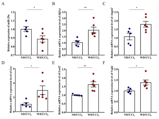 Furthermore, miR-29a decreased expression in high-risk HCC using WD/CCl4-treated mice (Figure 4A). Expanding evidence has revealed that miR-29a is indispensable in chronic liver disease [26]. We uncovered that liver tissue of mice treated with WD/CCl4 upregulated the expression of HIF-1α and Angpt2 (Figure 4B,C). This finding is consistent with liver cancer patients’ bioinformatics analysis and regulatory network, whereas Lox, Loxl2, and Vegfα mRNA expression also increased in WD/CCl4 mice rather than ND/CCl4 mice (Figure 4D–F).