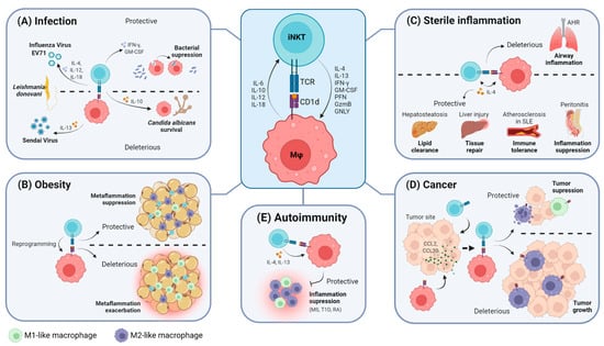 iNKT cells and macrophages interact under different pathological contexts. This crosstalk primarily involves the recognition of antigen-loaded CD1d molecules by the iNKT cell TCR, followed by the exchange of cytokines and the interplay of other effector molecules that are specific to each paradigm. (A) The outcome of interactions between iNKT cells and macrophages in infectious environments. (B) The outcome of interactions between iNKT cells and macrophages in obesity. (C) iNKT cells and macrophages interact differently under distinct sterile inflammatory conditions. (D) The iNKT cell–macrophage axis in the context of cancer. (E) The outcome of the interplay between iNKT cells and macrophages in autoimmunity. Created with BioRender.com in 22 January, 2022. PFN: perforin; GzmB: granzyme B; GNLY: granulysin; MS: Multiple sclerosis; T1D: type I diabetes; RA: rheumatoid arthritis.