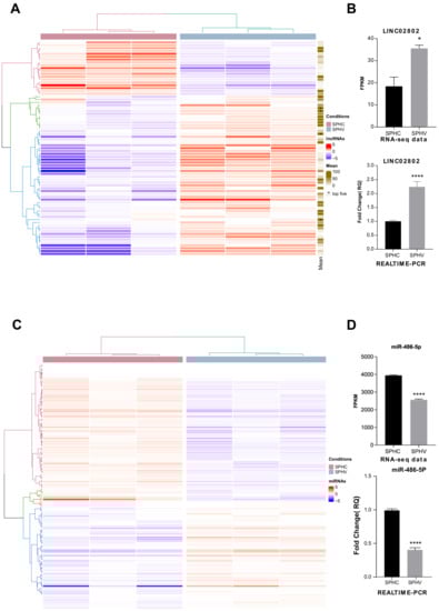 Identification of lncRNA and microRNA involved in the regulation of SA (A) Heatmap showing DE lincRNAs in SPHV versus SPHC with log2FC > 0.5 and FDR < 0.05. Color bar indicates log2FC. The mean column showed the expression rate within our experimental condition. (B) LINC02802 expression in SPHC and SPHV from RNA-sequencing data and LINC02802 expression in SPHC and SPHV measured by RT-qPCR. Data are represented as mean ± SEM of n = 3 experiments; *, p < 0.05. ****, p < 0.0001. (C) Heatmap showing DE microRNAs in SPHV versus SPHC with log2FC > 0.5 and FDR < 0.05. Color bar indicates log2FC. (D) mir-486-5p expression in SPHC and SPHV from RNA-sequencing data and mir-486-5p expression in SPHC and SPHV measured by RT-qPCR. Data are represented as mean ± SEM of n = 3 experiments; ****, p < 0.0001.