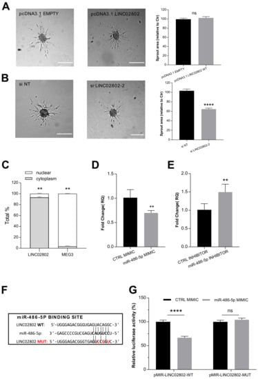 ECs were then transfected with a miR-486-5p mimic/inhibitor or with the corresponding controls and used to perform the sprouting assay. As expected, miR-486-5p over-expression significantly inhibited the sprouting of ECs (Figure 3A), whereas miR-486-5p inhibition did not affect the process (Figure 3B). To obtain further evidence of the interplay between miR-486-5p and LINC02802 on SA, we analyzed the expression of miR-486-5p after the knockdown and over-expression of LINC02802. As shown in Figure 3C, and in agreement with the ceRNA hypothesis, LINC02802 silencing increased the expression of miR-486-5p. Conversely, LINC02802 over-expression reduced miR-486-5p levels, but only when LINC02802 contained the intact binding site of miR-486-5p (Figure 3D). The evidence that LINC02802 negatively regulated miR-486-5p expression raised the question of if LINC02802, by controlling miR-486-5p levels in spheroids during the sprouting process, could prevent its anti-angiogenic effect. To test this possibility, we investigated the effect of LINC02802 over-expression on the anti-angiogenic effect mediated by miR-486-5p mimics. As shown earlier, the over-expression of miR-486-5p inhibited sprouting. However, the co-transfection of LINC02802 considerably restored sprouting activity (Figure 3E).