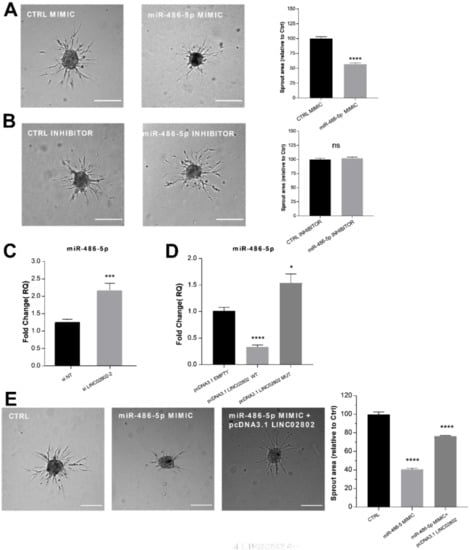 These data suggest that miR-486-5p has an anti-angiogenic effect on spheroids, and that LINC02802 and miR-486-5p exert an opposite effect in the regulation of the sprouting process. Therefore, taken together, these results support our hypothesis that LINC02802, acting as a sponge for miR-486-5p, plays a critical role in sprouting preventing the miR-486-5p anti-angiogenic effect and favoring the SA process.