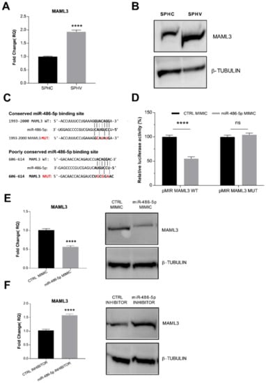 Our bioinformatic analysis based on Targetscan predictions indicated MAML3 as the protein coding gene involved in the LINC02802-miR-486-5p sponge circuit. To confirm this information, we first analyzed MAML3 expression in the SA model. As shown in Figure 4A,B, we found an increased expression of MAML3 after VEGF-A stimulation, which might indicate a negative correlation between miR-486-5p and MAML3 expression. Sequence analysis showed one conserved 8mer miR-486-5p binding element and one poorly conserved 7mer site for miR-486-5p on MAML3 3′-UTR (Figure 4C). In order to test whether miR-486-5p could post-transcriptionally regulate MAML3 by direct binding within the 3′-UTR region, a dual luciferase reporter assay was performed in ECs. As shown in Figure 4D, the co-transfection of the miR-486-5p mimic with pMIR-MAML3 WT significantly repressed luciferase activity. This inhibitory effect failed when ECs were transfected with the MAML3 mutant (pMIR-MAML3 MUT). We next sought to determine whether miR-486-5p can repress endogenous MAML3. To this end, we modulated the expression of miR-486-5p with the specific mimic and inhibitor and then examined MAML3 expression by RT-qPCR and Western blot analysis. As expected, the miR-486-5p mimic significantly repressed MAML3 expression (Figure 4E), whereas the miR-486-5p inhibitor markedly increased MAML3 at mRNA and protein levels (Figure 4). These data indicate that miR-486-5p directly targets MAML3 and represses its expression.