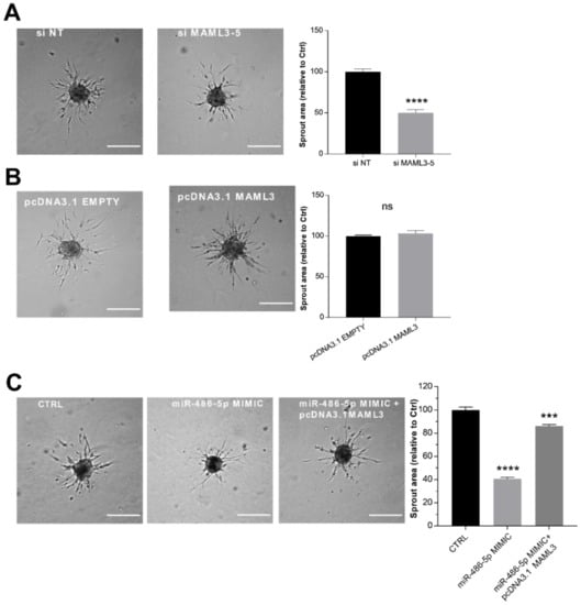 MAML3 over-expression counteracts the inhibitory effect of miR-486-5p on SA (A) Sprouting assay performed with ECs transfected with an siRNA against MAML3, and its quantification. (B) Sprouting assay performed with ECs transfected with pcDNA3.1 MAML3, and corresponding quantification. (C) Sprouting assay performed with ECs transfected with miR-486-5p mimic alone or co-transfected with miR-486-5p mimic and pcDNA3.1 MAML3. Scale bars = 200 µm. Total sprout area relative to control spheroids is showed. Data are representative of three independent experiments and shown as mean ± SE; ****, p < 0.0001; ***, p < 0.001.