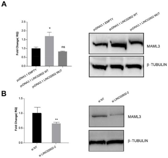 Finally, to confirm that LINC02802 act as a ceRNA and to evaluate the effect of the interaction between LINC02802 and miR-486-5p on MAML3, we examined the expression of MAML3 both at transcript and protein level following the manipulation of LINC02802 expression. We found that the over-expression of LINC02802 resulted in an increased expression of MAML3, but only when the miR-486-5p binding site was intact (Figure 6A). On the contrary, the knockdown of LINC02802 resulted in a decreased expression of MAML3 (Figure 6B). Overall, these results indicate that lincRNA LINC02802, acting as a ceRNA for miR-486-5p, affects the abundance of miR-486-5p and indirectly impacts MAML3 expression.