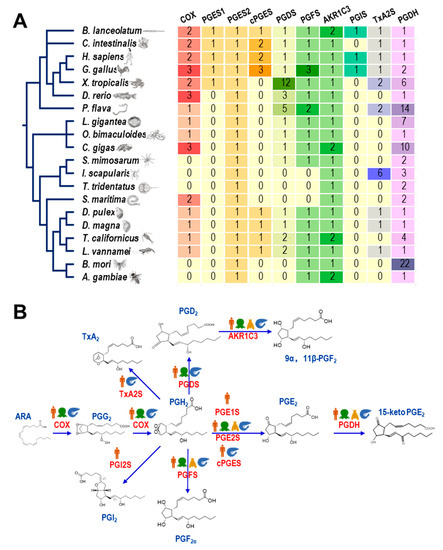 (A) Gene numbers of COX, PGSs, and PGDH in 20 species from different taxa; (B) presences of genes involved in the prostaglandin pathway from four major taxa.