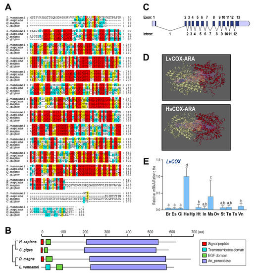 (A) Alignment of the COX a.a. sequences among four species including L. vannamei (XP027218437.1), H. sapiens (NP000954), D. magna (XP032795448.2), and C. gigas (XP011440168.2). The conserved residues are boxed in red, and similar residues are labeled in yellow; (B) the structural domains of COX proteins predicted by SMART; (C) exon/intron organization of LvCOX gene. The ORFs and UTRs in exons are marked in dark gray and empty boxes, respectively, and the introns are labeled with solid lines. The positions for 13 exons are 231–283, 2444–2557, 2723–2842, 2971–3114, 3307–3450, 3617–3798, 4019–4102, 4493–4633, 4943–5057, 5228–5403, 5561–5672, 5825–6038 and 6196–6444, and for 12 introns are 289–2443, 2558–2722, 2843–2970, 3115–3306, 3451–3616, 3799–4018, 4103–4492, 4634–4942, 5058–5227, 5404–5560, 5673–5824, and 6039–6195; (D) 3D structures and substrate binding regions of COXs in L. vannamei and H. sapiens; (E) relative mRNA ratio of LvCOX transcripts among different tissues including the brain (Br), eyestalk (Es), gills (Gi), hemocyte (He), hepatopancreas (Hp), heart (Ht), intestines (In), muscle (Ms), ovary (Ov), stomach (St), thoracic ganglion (Tn), testis (Ts), ventral ganglion (Vn). The experimental groups denoted by the same letter represent a similar level of transcript expression (p > 0.05, ANOVA, followed by Fisher LSD test).