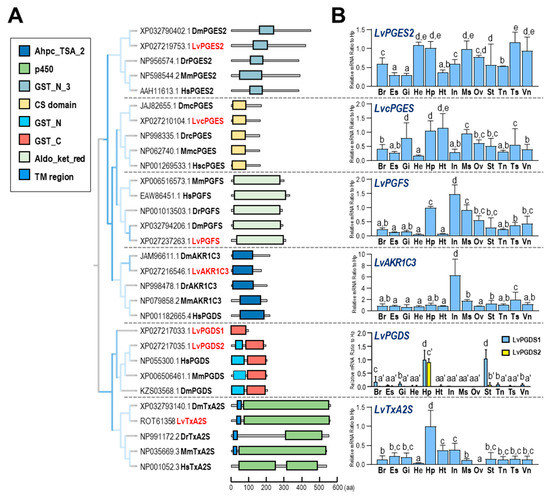 (A) phylogenetic analysis and the structural domain organization of multiple PGS genes in various species. The selected species include D. magna, L. vannamei, H. sapiens, D. rerio, and Mus musculus; (B) relative mRNA ratio of multiple LvPGS genes (LvPGES2, LvcPGES, LvPGFS, LvAKR1C3, LvPGDS1, LvPGDS2, and LvTxA2S) among different tissues, including brain (Br), eyestalk (Es), gills (Gi), hemocyte (He), hepatopancreas (Hp), heart (Ht), intestines (In), muscle (Ms), ovary (Ov), stomach (St), thoracic ganglion (Tn), testis (Ts), and ventral ganglion (Vn). The experimental groups denoted by the same letter represent a similar level of transcript expression (p > 0.05, ANOVA, followed by Fisher LSD test).