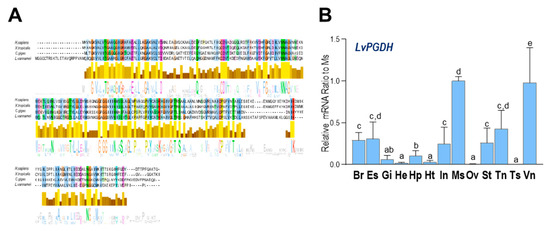 (A) Alignment of PGDH a.a. sequences among four species (H. sapiens, X. tropicalis, C. gigas, and L. vannamei); (B) relative mRNA ratio of LvPGDH transcripts among different tissues including the brain (Br), eyestalk (Es), gills (Gi), hemocyte (He), hepatopancreas (Hp), heart (Ht), intestines (In), muscle (Ms), ovary (Ov), stomach (St), thoracic ganglion (Tn), testis (Ts), ventral ganglion (Vn). The experimental groups denoted by the same letter represent a similar level of transcript expression (p > 0.05, ANOVA, followed by Fisher LSD test).