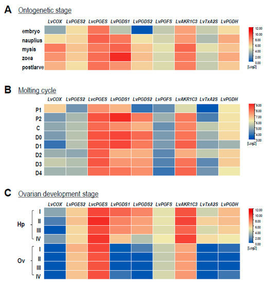The expression profiles of genes involved in the PG pathway of L. vannamei during different developmental processes: (A) ontogenetic stages, including embryo, nauplius, mysis, zoea, and post-larvae; (B) molting cycle, including postmolt (P1 and P2 stages), intermolt (C stage) and premolt (D0, D1, D2, D3, and D4 stages); (C) ovarian development, including hepatopancreas (Hp) and ovaries (Ov) in stages I to IV.