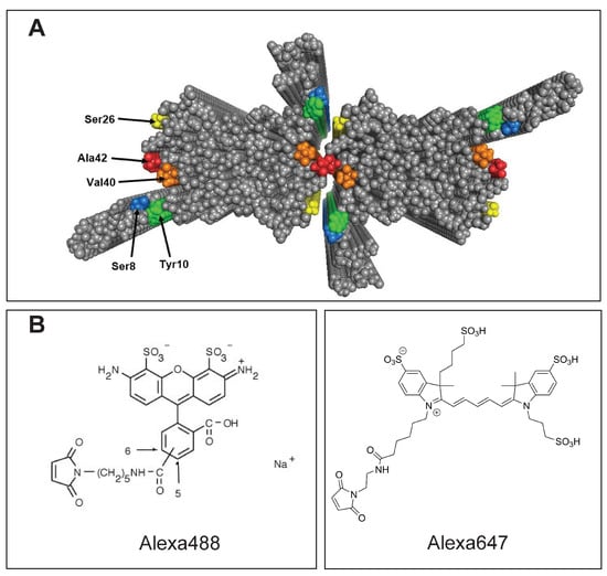 Labelling positions on the A42 fibril and the fluorophore labels used. (A) Structure of A42 fibrils with four monomers per plane based on solid state NMR [] and Small Angle X-ray Scattering (SAXS) []. The positions where cysteine is introduced through site directed mutagenesis are shown—Ser8 (blue), Tyr10 (green), Ser26 (yellow), Val40 (orange), Ala42 (red). These are the positions used for covalent attachment of Alexa fluorophores. (B) Molecular structures of Alexa488 and Alexa647.