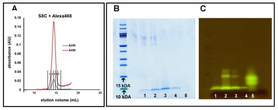 Evaluation of labelling of peptides with Alexa fluor. (A) Size exclusion chromatogram of S8C labelled with Alexa-488. The absorbance was monitored at 280 nm (blue) and 488 nm (red), which coincide during elution, indicating efficient labelling of S8C monomers. SDS PAGE analysis of the fractions collected from the SEC elution stained with coomassie (B) or with fluorescence imaging on a blue-light table with orange emission filter (C). Single bands prove that the monomers eluting are of the same molecular weight, and the fluorescence of the Alexa-488 dye prove that Alexa-488 has successfully bound to the S8C monomers. Note: The band at 15 kDA in wells 2 and 3 in (C) is a commonly observed SDS artefact for A42 [].