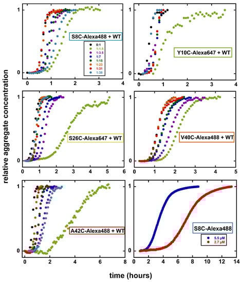 Aggregation kinetics for Alexa-labelled peptides. Aggregation kinetics for Alexa-labelled peptides in presence of different ratios of WT A42, as monitored by ThT fluorescence are shown. Aggregation was monitored in the presence of 6 M ThT in 20 mM sodium phosphate and 200 M EDTA at pH 8.0. (color codes given in the top left panel are the same for all of the peptides). Data are the median values of three replicates at each concentration from a single experiment. The bottom right panel shows the aggregation of S8C-Alexa488 alone as followed by the fluorescence from Alexa488, which is quenched upon aggregation. Normalized data are shown in all panels.
