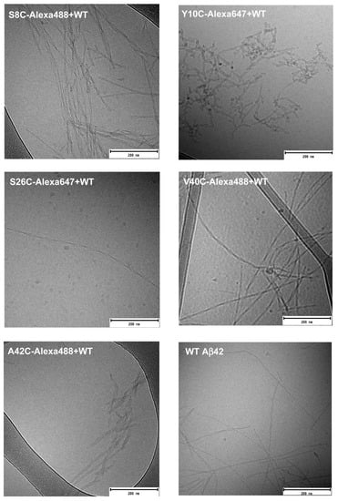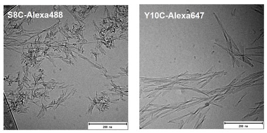 Finally, we note that the structures of the dye molecules Alexa488 or Alexa647 are very different, but this does not seem to affect fibril formation, which can be seen from V40C-Alexa488 and V40C-Alexa647 showing similar aggregation kinetics and fibril morphology (Supplementary Materials Figures S2 and S3).