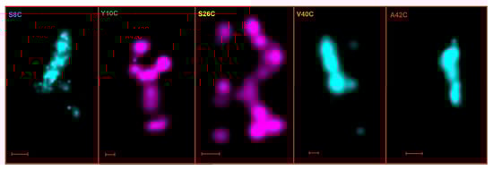 In the present study we optimize the position of covalent labelling of recombinant A42 with fluorophores incorporated at different surface-exposed positions of the peptide in A42 fibrils, as guided by recent high-resolution structures [,,]. To enable covalent labelling with thiol reactive fluorophores, we thus create five cysteine mutants of A42: S8C and Y10C for labelling of the unstructured N-terminal region, S26C, V40C and A42C on the surface of the fibril core (Figure 1). As a proof-of-concept, each mutant is labelled with Alexa488 and Alexa647, and the labelling efficiency is evaluated using size exclusion chromatography (SEC) and SDS PAGE. Aggregation assays of the labelled peptides, alone and in mixtures with unlabelled wild-type peptide, using thioflavin T (ThT) as well as Alexa probe fluorescence, were performed to study whether the perturbation of the fibril formation rate depends on the position of the label. Additionally, cryogenic transmission electron microscopy (cryoTEM) was used to determine the morphology of the labelled peptide fibrils compared to unlabelled WT A42 fibrils.