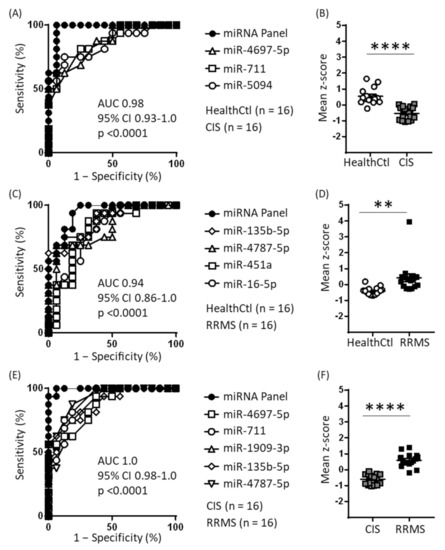 As a next step, the CIS- or RRMS-specific miRNAs were ranked based on their ROC AUC and p values, and panels comprising these miRNAs were investigated with respect to their predictive power relative to individual miRNAs. With respect to CIS–HealthCtl separation, a panel comprising the three most predictive miRNAs—miR-4697-5p, miR-711, and miR-5094—had higher predictive value than the most predictive single miRNA (Figure 3A), whilst the inclusion of additional CIS-specific down-regulated miRNAs did not yield further increase. Furthermore, the per subject mean z-scores of these three miRNAs were lower in CIS than HealthCtl (t(30) = 6.62, p < 0.0001; Figure 3B). For RRMS–HealthCtl separation, a panel comprising the four most predictive miRNAs—miR-135b-5p, miR-4787-5p, miR-451a, and miR-16-5p—had higher predictive value than the most predictive miRNA (Figure 3C), whilst the inclusion of additional RRMS-specific up-regulated miRNAs did not yield further increase. Furthermore, the per subject mean z-scores of these four miRNAs was higher in RRMS than HealthCtl (t(30) = 3.24, p = 0.003; Figure 3D). For CIS–RRMS separation, a panel comprising the three most predictive CIS-specific down-regulated miRNAs—miR-1909-3p, miR-711, and miR-4697-5p—and the three most predictive RRMS-specific up-regulated miRNAs—miR-4787-5p, miR-1909-3p, and miR-135b-5p—yielded higher predictive power than any of the individual CIS- or RRMS-specific miRNAs (Figure 3E); the per subject mean z-scores of these five miRNAs were higher in RRMS compared to CIS (t(30) = 8.95, p < 0.0001; Figure 3F). For the CIS–RRMS panel, between-subject correlation analyses between mean miRNA z-scores and EDSS scores were conducted separately for CIS and RRMS patients (Figure S4A,B): for CIS patients, a positive correlation was identified (r = 0.78, 95% CI = 0.44–0.92, p = 0.0007), whilst for RRMS patients, there was no correlation (r = −0.24, p = 0.36).