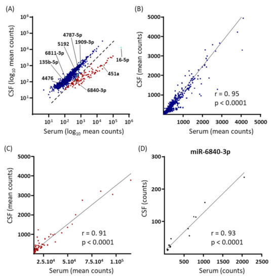 Comparison of EV miRNome expression in matched serum and CSF samples collected from RRMS-relapse patients (n = 16). (A) Scatterplot of the log10 transformed mean normalized counts for each of the 2151 mature EV miRNAs quantified in both sample compartments. Two miRNA populations were visualized based on their serum–CSF associations. The dashed line indicates the qualitative best-fit-line of separation between the two miRNA populations. In the larger population, with data points depicted in blue, serum and CSF expression levels were similar. In the smaller population, with data points depicted in red, serum expression levels were high relative to CSF levels. The nine RRMS-relapse specific miRNAs are indicated in turquoise and identified. (B) Pearson’s product-moment correlation analysis of the linear normalized counts of serum vs. CSF miRNAs belonging to the larger miRNA population in A; 12 miRNAs lay outside the axis limits. (C) Pearson’s correlation analysis of the linear normalized counts of serum vs. CSF miRNAs belonging to the smaller miRNA population in A; 1 miRNA lays outside the axis limits. (D) Pearson’s correlation analysis of serum vs. CSF linear normalized counts for the RRMS-specific miR-6840-3p. Pearson’s correlation coefficients and p values are reported in the graph.
