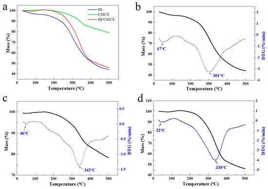 The thermal degradation behavior of SS, CMCS and SS/CMCS was evaluated by thermogravimetric analysis (TGA). From Figure 2a, it can be found that the TGA curves for both the freeze-dried SS/CMCS hydrogel and the SS solution have a similar type of spectral pattern. The likeness of the spectra can be attributed to the fact that the major component of SS/CMCS hydrogel is SS. It can be observed from Figure 2b–d that the derivative thermogravimetry (DTG) curves of all samples have an initial mass loss in the temperature range of 30–120 °C due to vaporization of the adsorbed moisture. The samples then experienced major, rapid mass losses between 120 and 500 °C, representing the thermal degradation via pyrolysis of the sample. It is known that the maximum thermal decomposition temperature (DTGmax) corresponds to a temperature where thermal degradation occurs at the highest rate. DTGmax is considered an essential parameter to determine and compare the thermal stability of the sample [33]. The results showed that the DTGmax values of SS and CMCS were 301 and 342 °C, respectively. The DTGmax of the SS/CMCS hydrogel was 330 °C, indicating the thermal stability of SS/CMCS was lower than that of CMCS while higher than that of SS. The intermediate DTGmax temperature can be attributed to the introduction of SS, which reduced the crystallinity of CMCS.