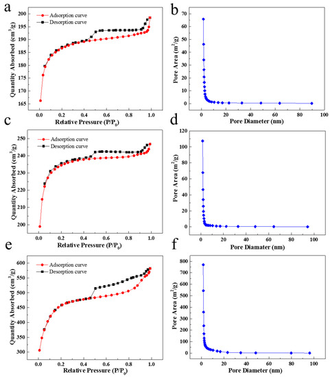 N2 adsorption–desorption isotherms and the pore size distributions of samples (a,b) SC850, (c,d) SC950 and (e,f) SC1050.