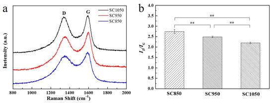 (a) Raman spectra and (b) calculated ID/IG values for samples SC850, SC950 and SC1050. (n = 3, ** p < 0.01).
