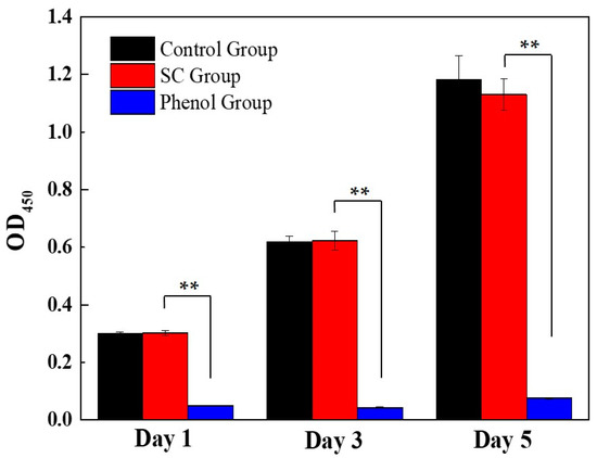 The cytotoxicity of the SC1050 was evaluated to ensure that its usage would not cause health problems. The phenotype of HEK-293 cells for the control group, the SC1050 group, and the phenol group are shown in Figure S7. As depicted in Figure 6, the positive control group demonstrated a significantly lower OD450 value when compared with that of the control group and the SC1050 group. However, there was no statistically significant difference between the OD450 values of the control group and the sample group, indicating that SC1050 is not toxic.