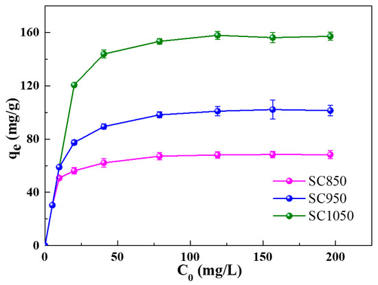 The initial dye concentration provides an important driving force to enhance the adsorption properties of the adsorbents for the dye molecules [39]. The experiment was therefore conducted at the initial MB concentrations of 5, 10, 20, 40, 80, 120, 160 and 200 mg/L. The pH of the mixture was adjusted to 7 and was maintained at 25 °C in an incubator operated at a speed of 150 rpm. As shown in Figure 7, when the initial concentrations of MB in solution were within the range of 5–80 mg/L, the adsorption capacity of all SC samples enhanced with a rise in initial MB concentration. The results can be attributed to the driving force of the increased initial MB concentration, which helped to overcome the mass transfer resistance of MB between the aqueous and the solid phase [40]. As shown in Figure S8, the color of the MB solution turned transparent or light blue after the adsorption experiment. From Figure 7, it was found that the saturation was not reached at MB initial concentration of 80 mg/L, such initial concentration was therefore selected for the subsequent experiments.