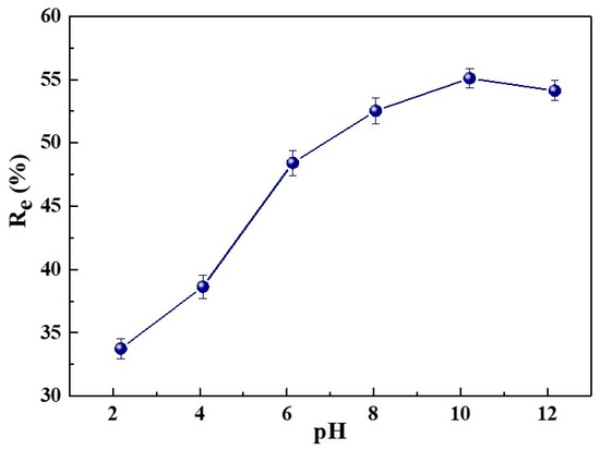 Solution pH plays an important role in the adsorption process because the solution pH can affect the surface charge of the adsorbent and the degree of ionization of dye molecules [39]. The impact of the solution’s initial pH was explored by adding 5 mg of SC1050 into the MB solution, with an initial concentration of 80 mg/L, at an initial pH of 2, 4, 6, 8, 10 or 12. The adsorption experiment was carried out at a temperature of 25 °C in an incubator with a shaking speed of 150 rpm. As shown in Figure 8, the adsorption capacity of SC1050 increased dramatically as the solution initial pH increased from 2 to 10, where Re increased from 33.76 ± 0.80% to 55.11 ± 0.75%. Because pHpzc of SC1050 was 7.3 (Figure S9) at pH lower than pHpzc, the SC1050 surface was positively charged. The repulsion between the cationic dye molecule, MB in our case, and the positively charged surface would lead to a decrease in MB adsorption. At pH higher than pHpzc, the SC1050 surface was negatively charged, promoting the adsorption of cationic MB molecules. However, when the solution pH was greater than 10, a slight decrease in adsorption capacity of SC1050 can be observed, which can be attributed to the poor stability of MB at high pH (Figure S10 exhibits the peak position shift of the UV-Vis spectrum of MB at pH of 12) [45], rather than the adsorption capacity decrease in SC1050.