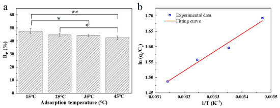 To explore the effect of temperature on adsorption behavior of SC1050, 5 mg of SC1050 was added into MB solution at an initial concentration of 80 mg/L with an adjusted pH of 10. The test was performed at temperatures of 15, 25, 35 and 45 °C in an incubator with a shaking speed of 150 rpm. As shown in Figure 9a, when the temperature increased from 15 to 45 °C, the value of Re decreased from 47.53 ± 2.04% to 42.44 ± 1.36%, indicating that the adsorption process was more favorable at low temperature.