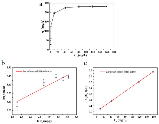 (a) Adsorption isotherm, (b) Langmuir fitting and (c) Frundlich fitting.