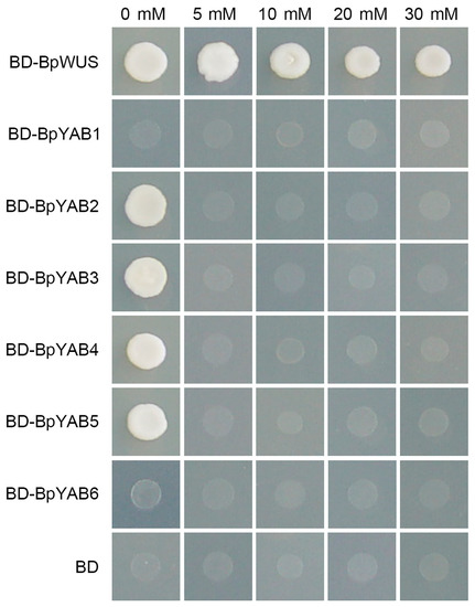 To perform the transactivation activity assay, the ORF of BpYABs was cloned into the pBridge vector. The restriction enzymes and primers are provided in Table S7. The pBridge-BpYABs vectors were transformed into Saccharomyces cerevisiae (AH109, BD Biosciences, Palo Alto, CA, USA) according to the manufacturer’s protocol. Transformed yeasts were screening cultured on SD medium without His and Trp. Then, the positive yeast cells were dropped on SD-Trp-His plates containing 3-AT (0 to 30 mM) and incubated at 30 °C for about 3 days. This experimental procedure was referenced in Tang et al. [28].