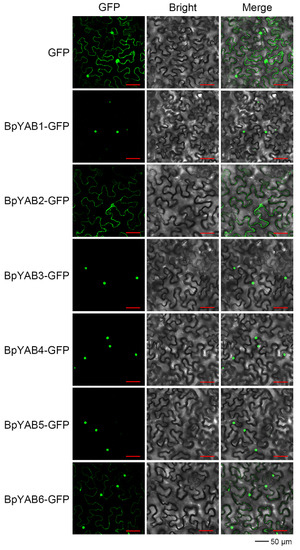 The pCAMBIA1300-GFP was used as a positive control to illustrate the subcellular localization of BpYABs. The GFP signal of four BpYABs (BpYAB1, BpYAB3, BpYAB4, and BpYAB5) GFP fusion proteins was observed exclusively in the nucleus, suggesting that these four BpYABs were localized in the nucleus. The GFP signal of the BpYAB2-GFP and BpYAB6-GFP fusion proteins was in both the nucleus and cytoplasm (Figure 3), indicating that these two BpYABs were not unique nuclear localization proteins.