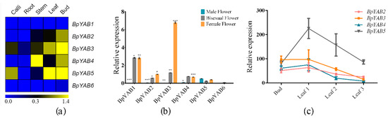 None of the BpYAB members were expressed in the root, but were mainly expressed in the bud, stem, leaf and flower (Figure 4a), indicating that the YABBY family functioned during aboveground organ development. However, neither BpYAB1 nor BpYAB6 was expressed in the vegetative organs, including the bud, stem, and leaf (Figure 4a). This expression pattern was consistent with their counterparts in Arabidopsis, CRC, and INO, which were not expressed in vegetative organs as well. Except for the two abovementioned genes, the remaining four BpYABs were highly expressed in the bud (Figure 4a). Moreover, BpYAB3 and BpYAB5 were strongly expressed in the mature leaf and lowly expressed in the stem, implying that these two genes may be involved in leaf development. On the other hand, BpYAB4 had a relatively higher expression in the stem and lower expression in the leaf, indicating that BpYAB4 may function in stem growth (Figure 4a). Except for BpYAB6, the BpYABs were all expressed in the flowers, especially in the female flower and bisexual flower (Figure 4b). BpYAB3 showed a higher expression in the female flower than in the bisexual flower (p < 0.001) among the rest of the BpYABs, and this implied that BpYAB3 was specific for female flower development (Figure 4b). In addition, only three members were expressed in the male flower, and BpYAB5 showed a higher expression than BpYAB2 and BpYAB4 (Figure 4b). To check the expression dynamics of four vegetative BpYAB genes in leaves, we obtained the FPKM values of three developmental stage leaves from the transcriptome sequencing data of paper mulberry. Leaf 1 means the newly grown leaf visible to the human eye, Leaf 2 is the tender leaf, and Leaf 3 represents the mature leaf. All the BpYAB genes showed a medium level in the bud and reached the highest expression in the Leaf 1 stage, then decreased with the leaf growing. The expression levels of BpYAB5 were twice as high as those of the other three genes during leaf development (Figure 4c). It was interesting to find that BpYAB5 showed high activity in many tissues, including both vegetative organs and reproductive organs, but mostly in leaves (Figure 4).