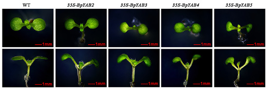 Ectopic overexpression of BpYAB2, BpYAB3, BpYAB4, and BpYAB5 in Arabidopsis affected the morphology of Arabidopsis leaves. Compared with the wild-type Arabidopsis (Col-0), the transgenic line showed that the cotyledons curled downward to form an inverted bowl-shaped leaf, and the leaf area was relatively smaller. The leaves of the wild-type Arabidopsis were flat (Figure 6). When the seedlings were transplanted to nutrient soil and cultured for 10 days, it was found that in the transgenic line, the true leaves of Arabidopsis also appeared curled at the leaf edge, and some of them showed a twisted phenotype. The growth of the entire plant was slower than that of the wild-type (Figure S5).