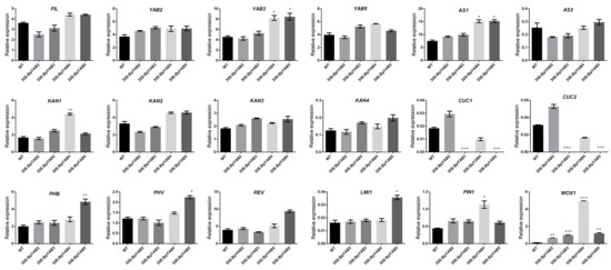 The expression level of genes involved in adaxial–abaxial leaf development were analyzed by qRT-PCR. The transcript levels were normalized against the expression of AtACTIN2 (AT3G18780). Three biological replicates were taken in this experiment. The 2−ΔΔCt method was used to analyze the data and the p value was calculated by means of the T Student test and variance analysis (ANOVA) with significance levels of 5% (p < 0.05). The GenBank accession numbers of Arabidopsis used in this study are listed as follows: AtYAB2 (AT1G08465), AtYAB3 (AT4G00180), AtYAB5 (AT2G26580), AtFIL (AT2G45190), AtAS1 (AT2G37630), AtAS2 (AT1G65620), AtKAN1 (AT5G16560), AtKAN2 (AT1G32240), AtKAN3 (AT4G17695), AtKAN4 (AT5G42630), AtCUC1 (AT3G15170), AtCUC2 (AT5G53950), AtPHB (AT2G34710), AtPHV (AT1G30490), AtREV (AT5G60690), AtLMI1 (AT5G03790), AtPIN1 (AT1G73590), and AtWOX1 (AT3G18010). Primers of qRT-PCR used in transgenic Arabidopsis are found in Table S5.